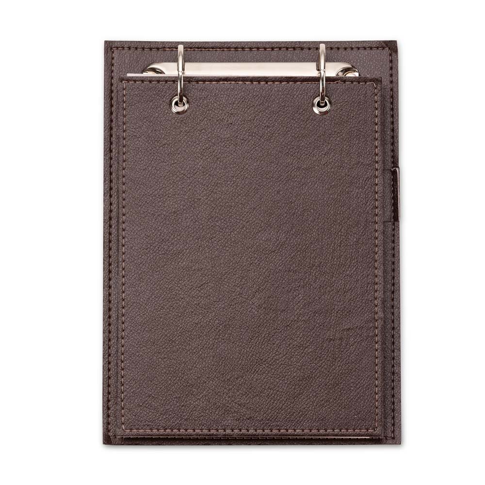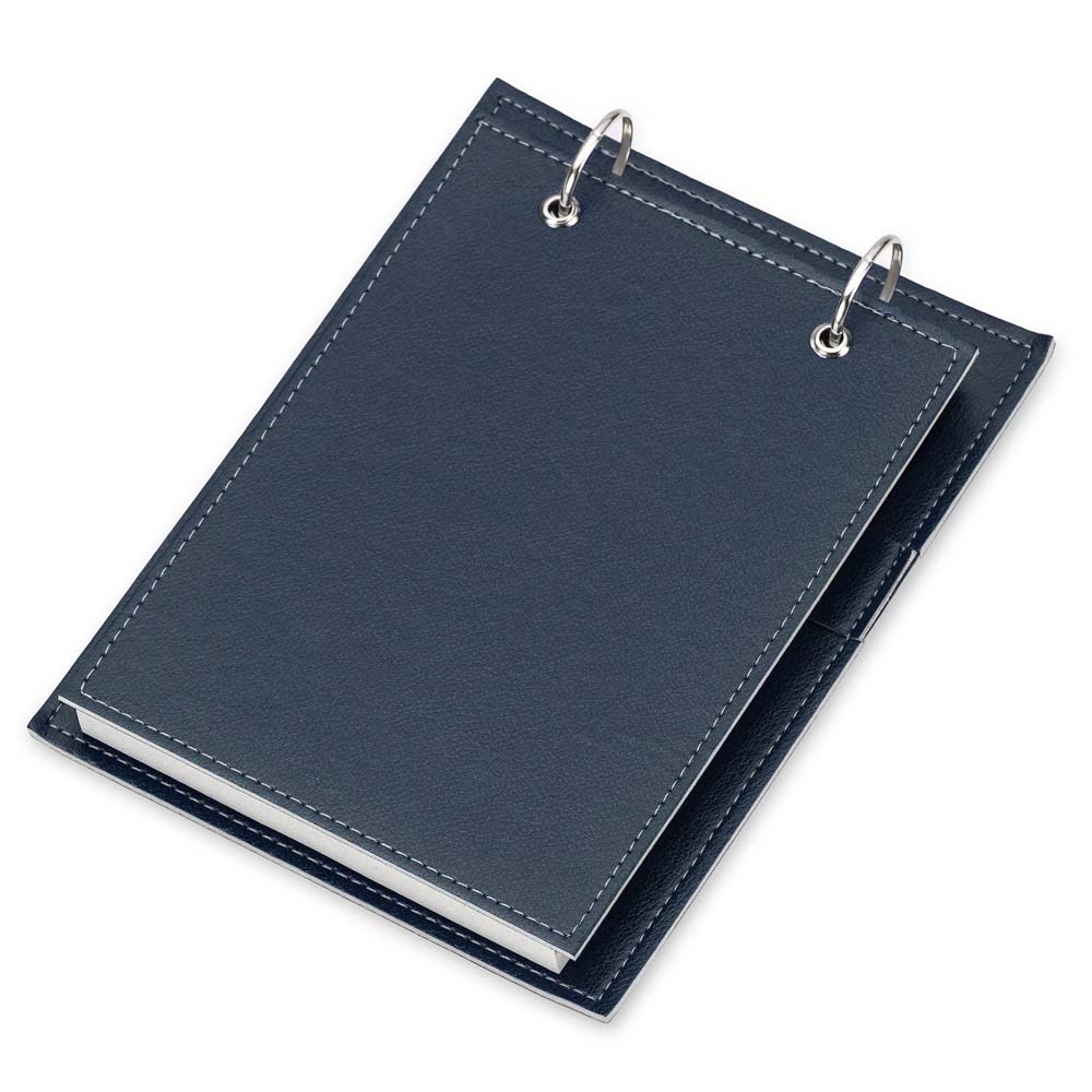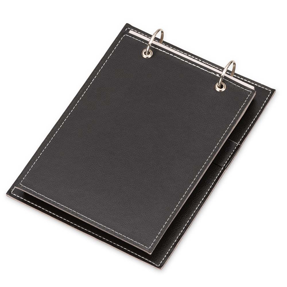 Bloco de anotações de mesa com trilho de ferro, capa em couro sintético. Possui suporte na lateral interna para colocar caneta (não acompanha) e aproximadamente 96 folhas recicladas com área destacável.