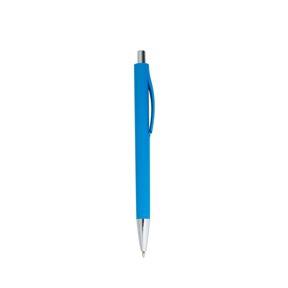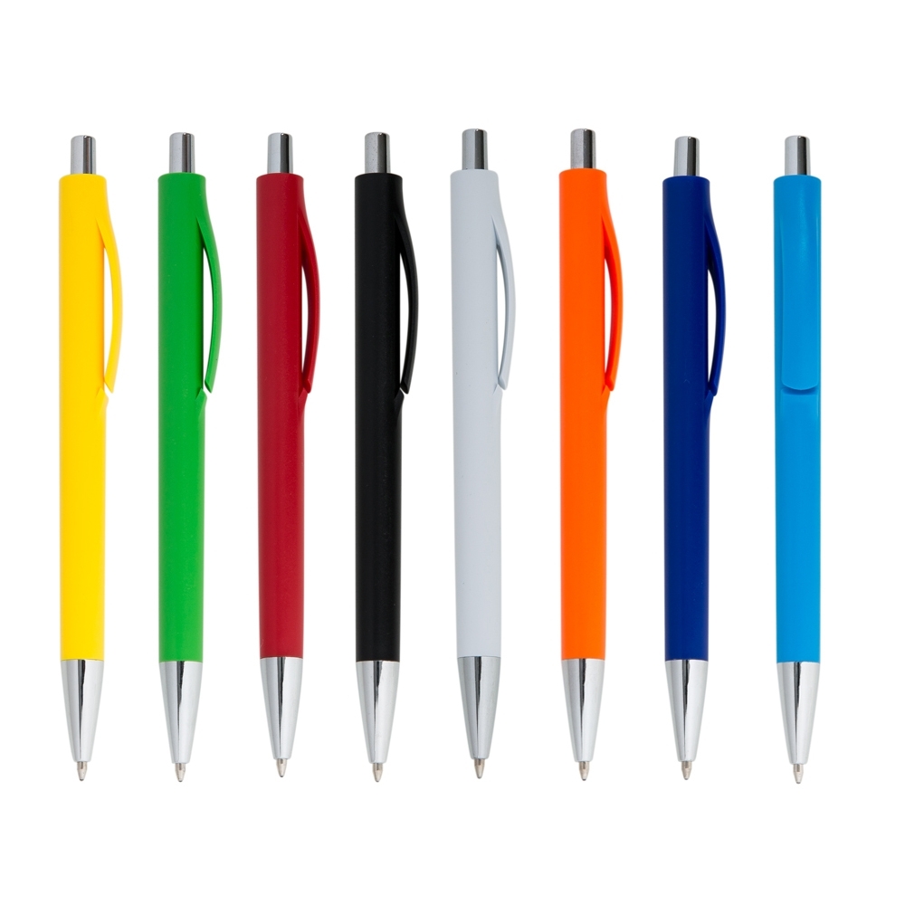 Caneta plástica colorida com detalhes prata. Corpo inteiro colorido com clip PLÁSTICO, possui acionador e ponteira prata. Aciona por clique. PEDIDO MÍNIMO 100 peças!